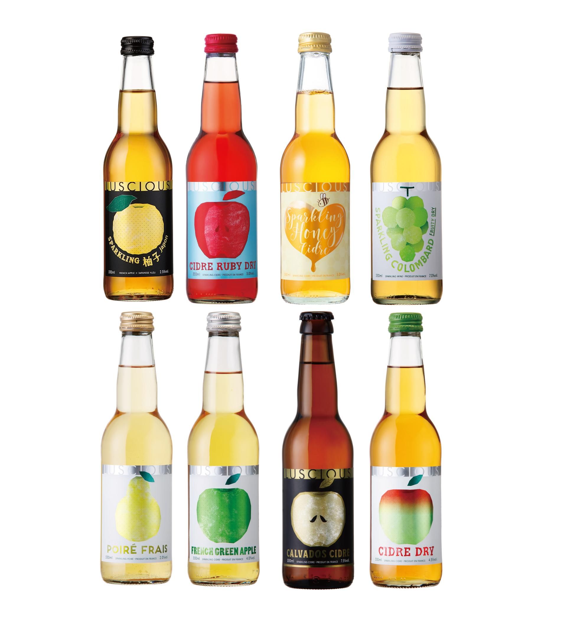 アルコール度数:ポワレフレッシュ2.0%/フレンチグリーンアップル4.0%/カルヴァドスシードル7.5%/シードルドライ4.5%/スパークリング柚子 2.5%/シードルルビードライ3.0%/スパークリングハニーシードル3.0%/スパークリングコロンバール7.0%